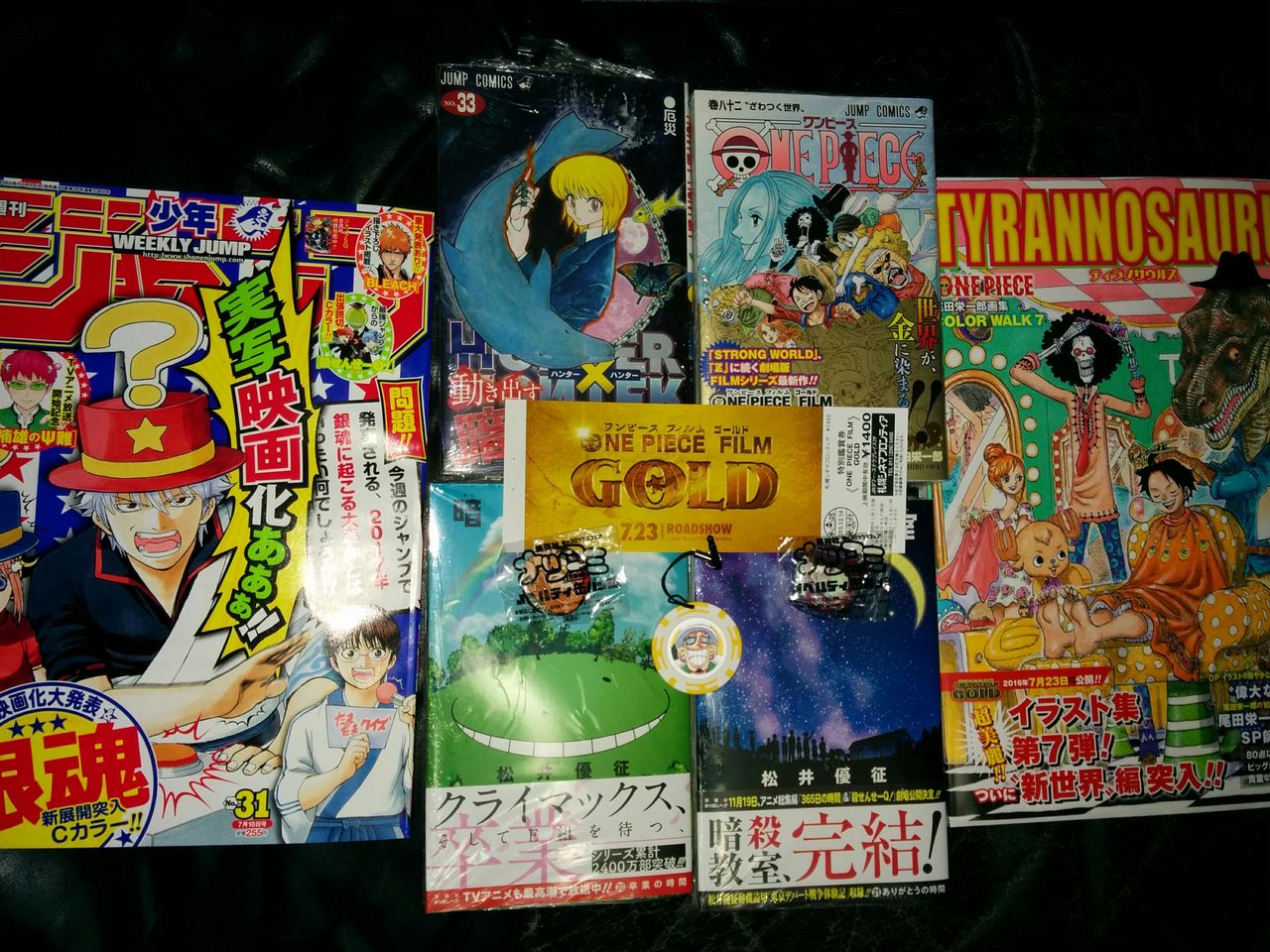 今週号のジャンプ、ワンピース最新刊、ワンピース最新画集、ハンターハンター最新刊、暗殺教室コミックス二冊、ワンピース映画前売り券!