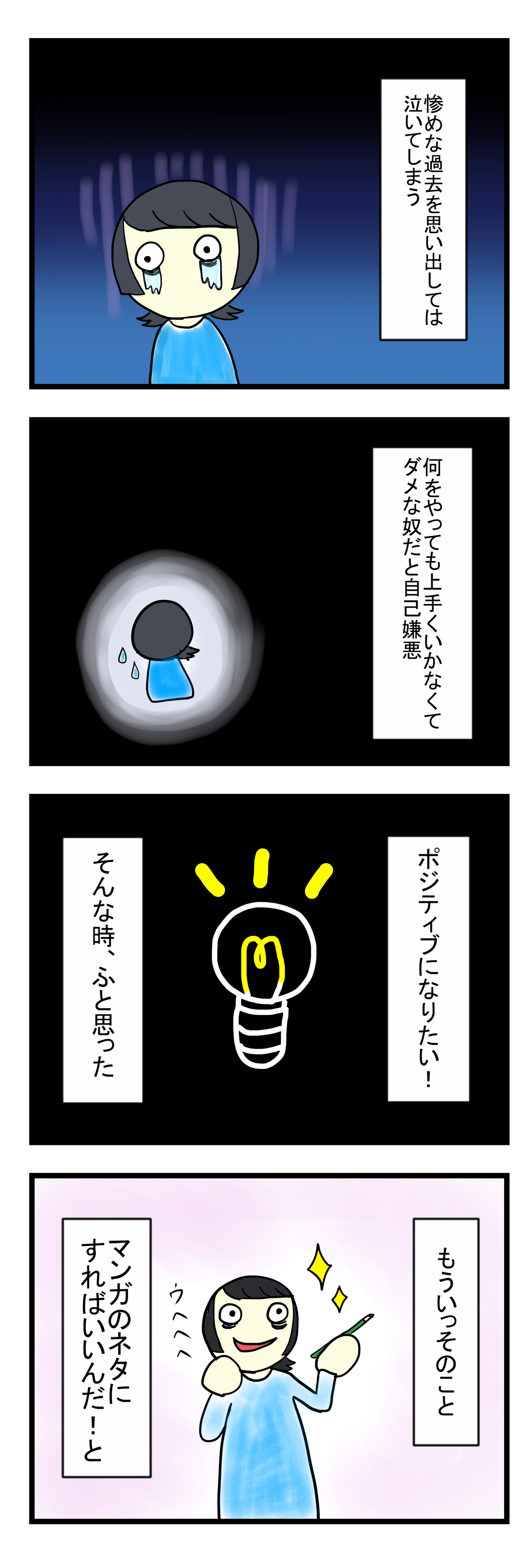また、文字だけだとせっかくの黒歴史=ネタの面白さが半減なので、4コマ漫画にしてやろうと企み、このように下手な絵ではありますが漫画にしてみました。