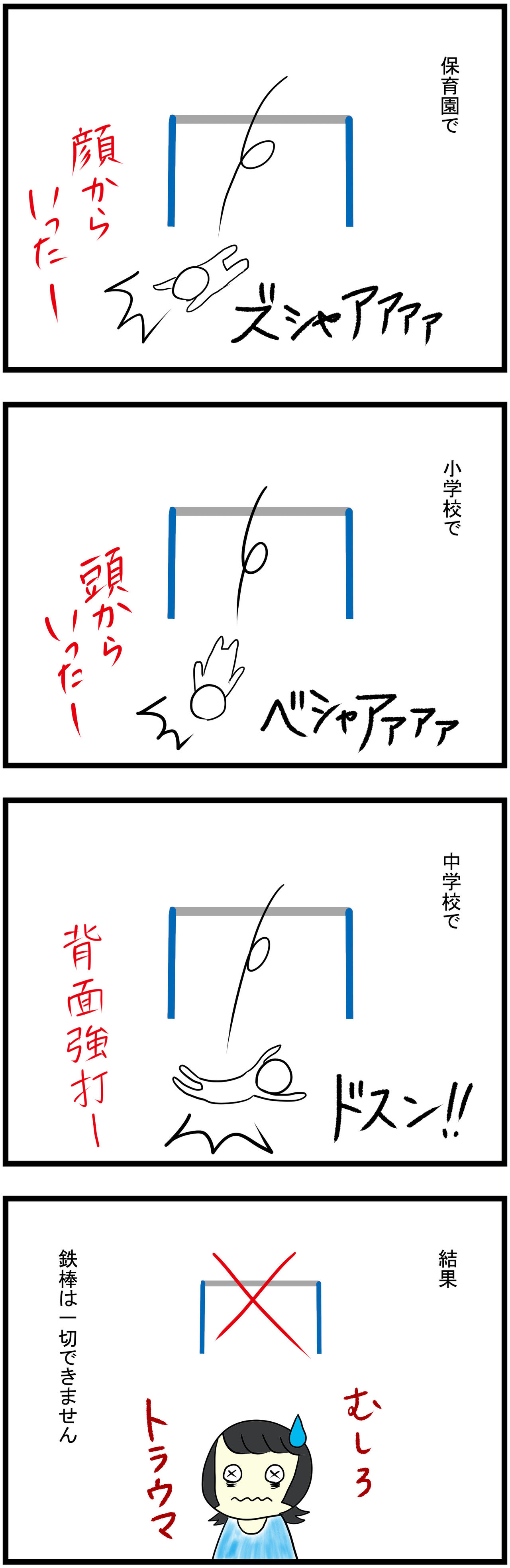 まあ、最初に落ちた時から鉄棒が怖くなって、あんまり近づかなかったんだけどさ。